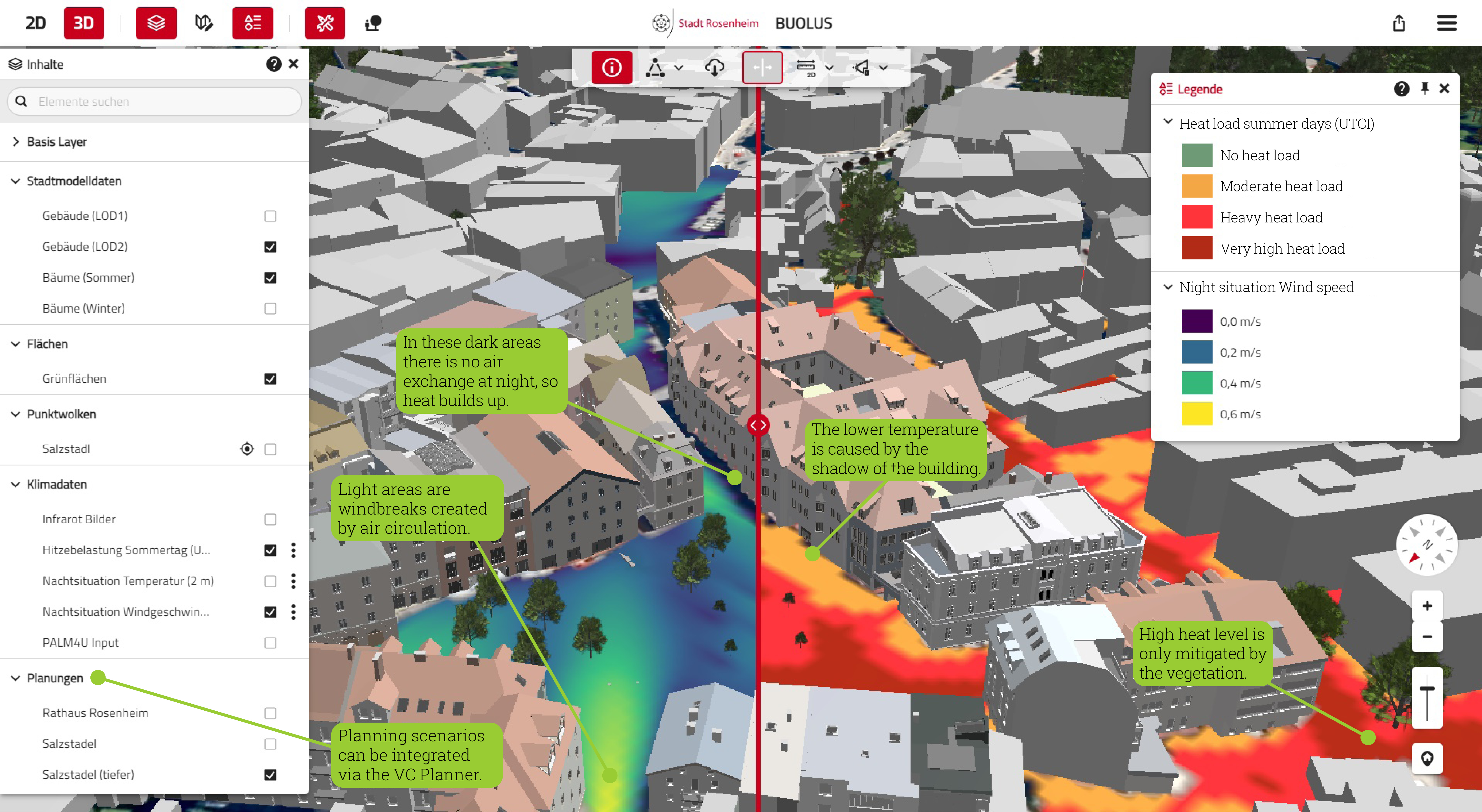 Figure 2. Urban climate simulations and what-if scenarios, visualized in VC Map.